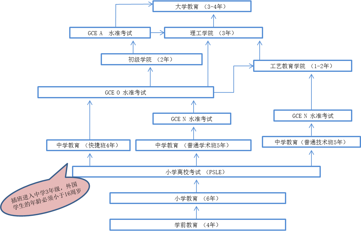 备注: 1. 幼儿园: 新加坡的大多数幼儿园都接受外国学生 2. 小学: 小学教育为6年。外国学生进政府小学的最后阶段是小五。私立学校没有限制。 3. 中学: 中学教育为4年。外国学生进政府中学的最后阶段是中三。私立学校没有限制。 4. 如果没有新加坡剑桥O水准证书,学生将很难进入初级学院,理工学院和大学预科。 5. 在政府或国际学校就读的18岁以下的外国学生可以有一名直接家属陪读包括母亲,父亲,祖母/外祖母,祖父/外祖父。